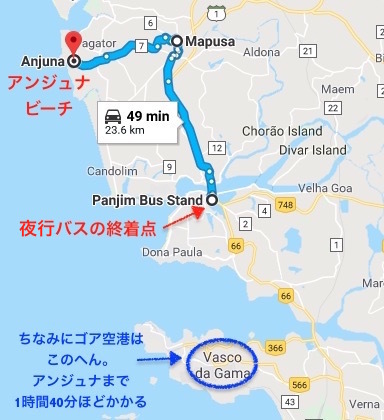 夜行バスの到着地からアンジュナビーチへ