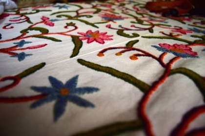 この太めのデザインの刺繍もカシミールの有名な手工芸品。シーツやカーテンに散りばめられていて素敵。