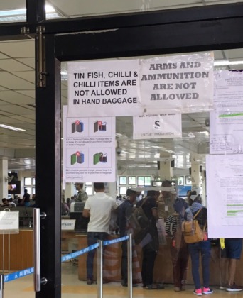 空港の注意書き。魚の缶詰とトウガラシ🌶️は持ち込み禁止!